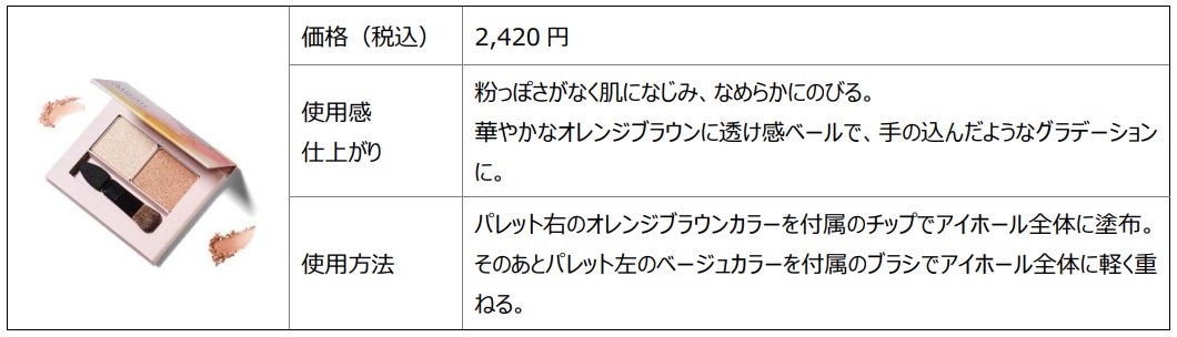 オレンジブラウンの「アクセントカラー」と、肌なじみがよいベージュ「クリアベールカラー」の計算された2色のアイカラー。肌の色を拾わず見たままの色を発色させる「キャンバス粒子」で、深みのあるグラデーションをつくってもくすまず美しく発色。軽やかなのに印象的な 目もとに。