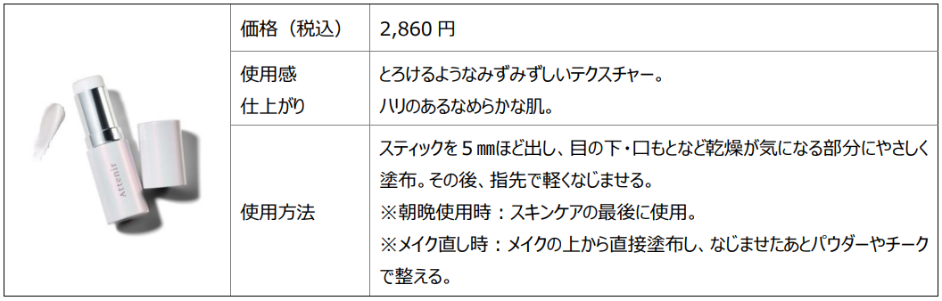 うるおいを引き込み・抱え、そしてうるおいでハリのあるなめらかな肌印象になるスティック状美容液。2色をレイヤードするだけで大人の抜け感メイクがつくれるアイカラー。一日中美しい仕上がりをキープするジェルアイライナー。そして、ポンポンと肌にオンするだけで簡単キレイ、肌に溶け込むスキンカラーが自然な血色とツヤをプラスするチーク、全4アイテムを用意。
