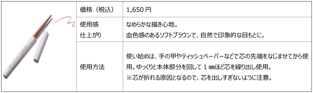 なめらかな描き心地を叶えるやわらかい芯がスルスル伸びて、なめらかにフィットするジェルアイライナー。血色感あるソフトブラウンのカラーが、自然で印象的な目もとを演出。「密着オイル」×「ウォータープルーフ処方」の W のロングラスティング処方で、肌に密着し 美しい仕上がりをキープ。