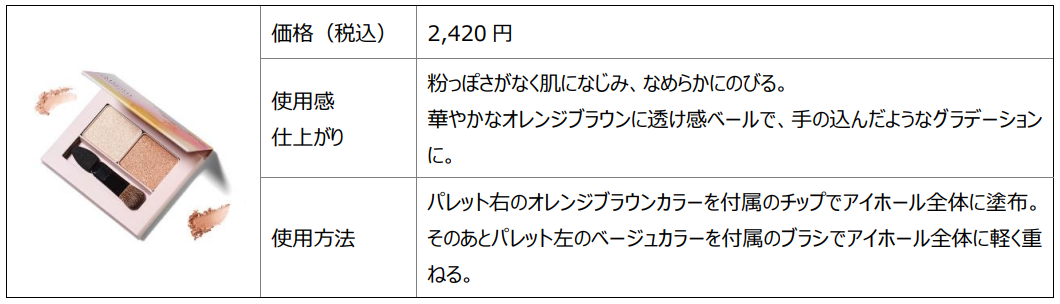オレンジブラウンの「アクセントカラー」と、肌なじみがよいベージュ「クリアベールカラー」の計算された2色のアイカラー。肌の色を拾わず見たままの色を発色させる「キャンバス粒子」で、深みのあるグラデーションをつくってもくすまず美しく発色。軽やかなのに印象的な 目もとに。