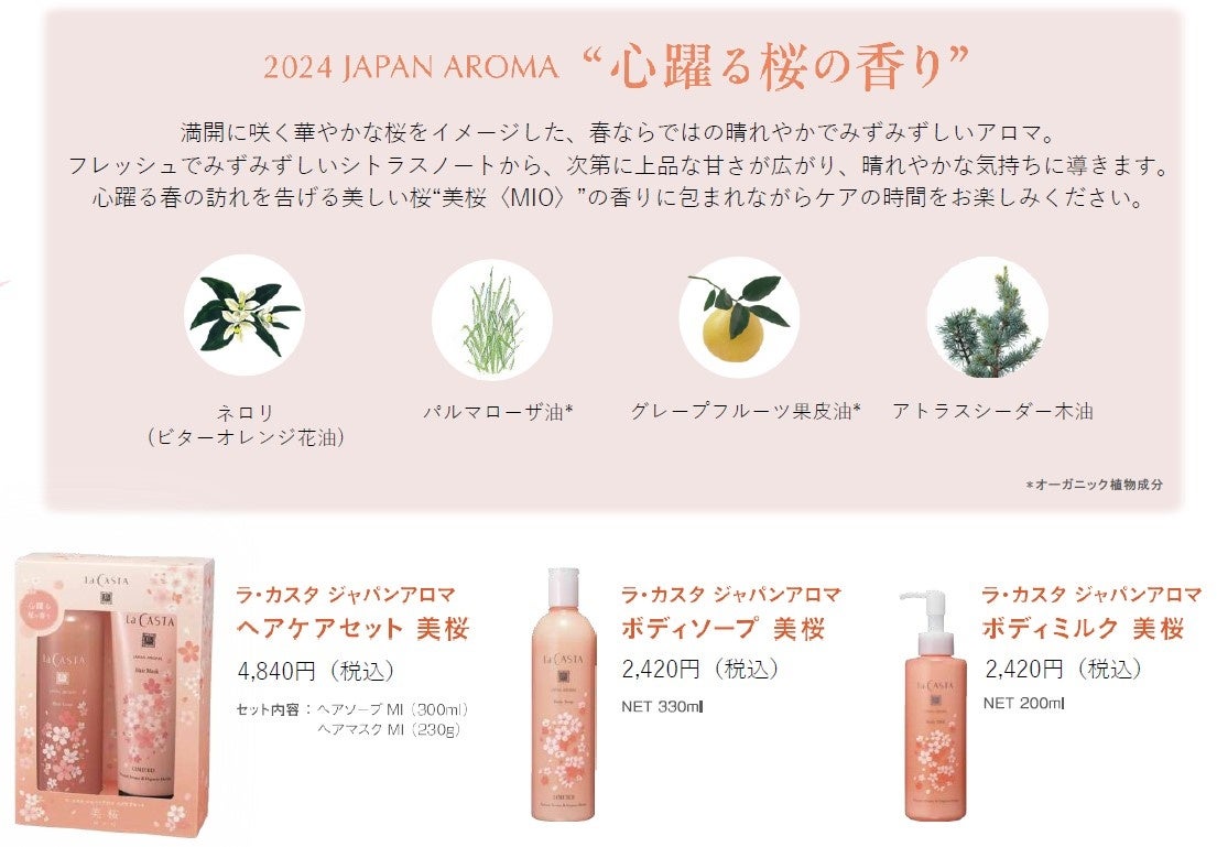 ジャパンアロマシリーズは、日本生まれのブランドであるラ・カスタが、情緒溢れる桜の香りを、繊細なブレンドで表現することを大切に毎年進化を重ねてきました。ヘアケアセット、ボディソープに加え、今年はボディミルクもラインナップに登場。2024年の春の訪れを告げる「桜」をお届けします。