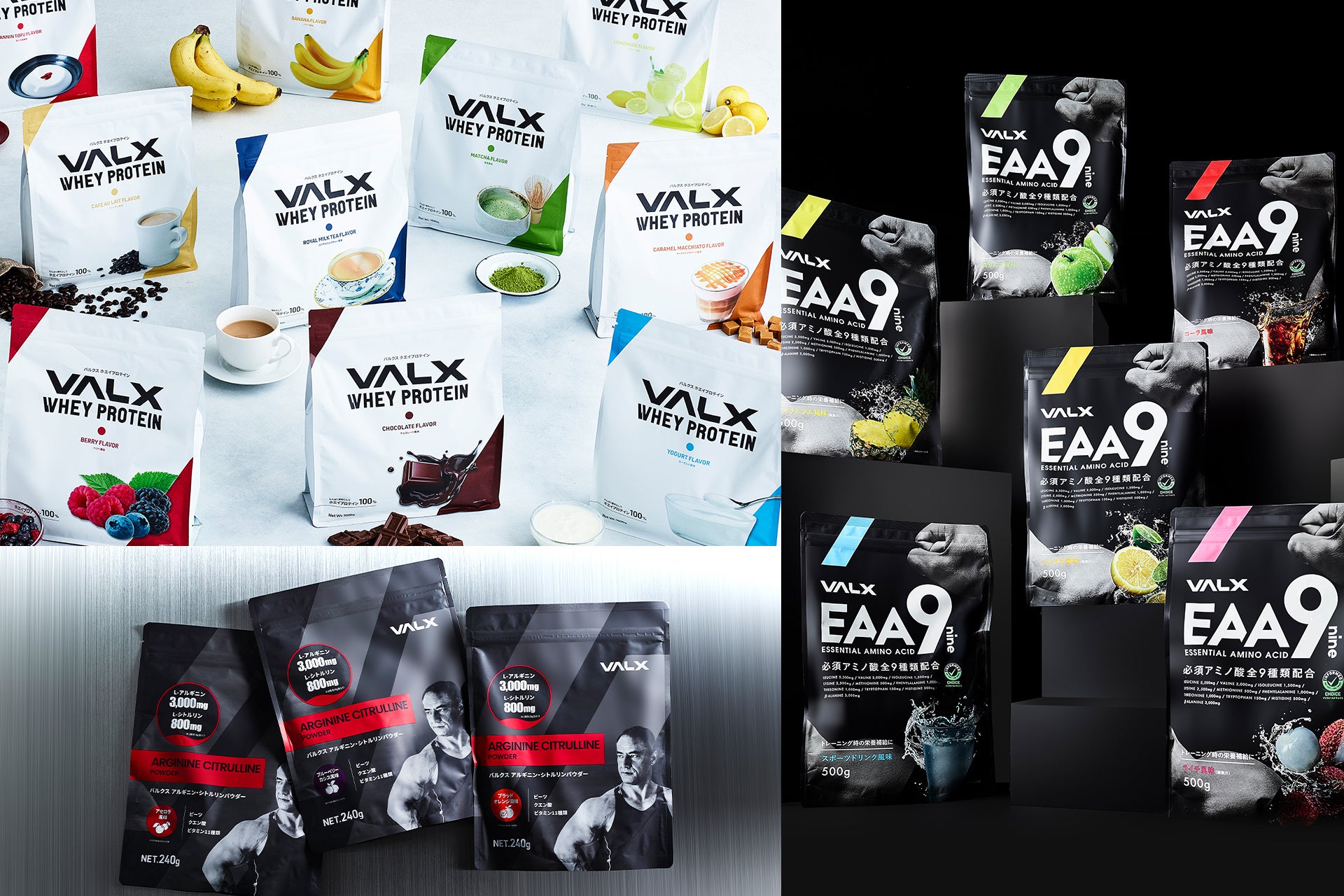 今回提供開始となった商品は、身体を構成する主要成分タンパク質が摂取できる「VALX ホエイプロテイン」、体内で合成することができない必須アミノ酸のサプリメント「VALX EAA9」、プレワークアウトドリンクとしておすすめの「VALX アルギニン・シトルリンパウダー」です。