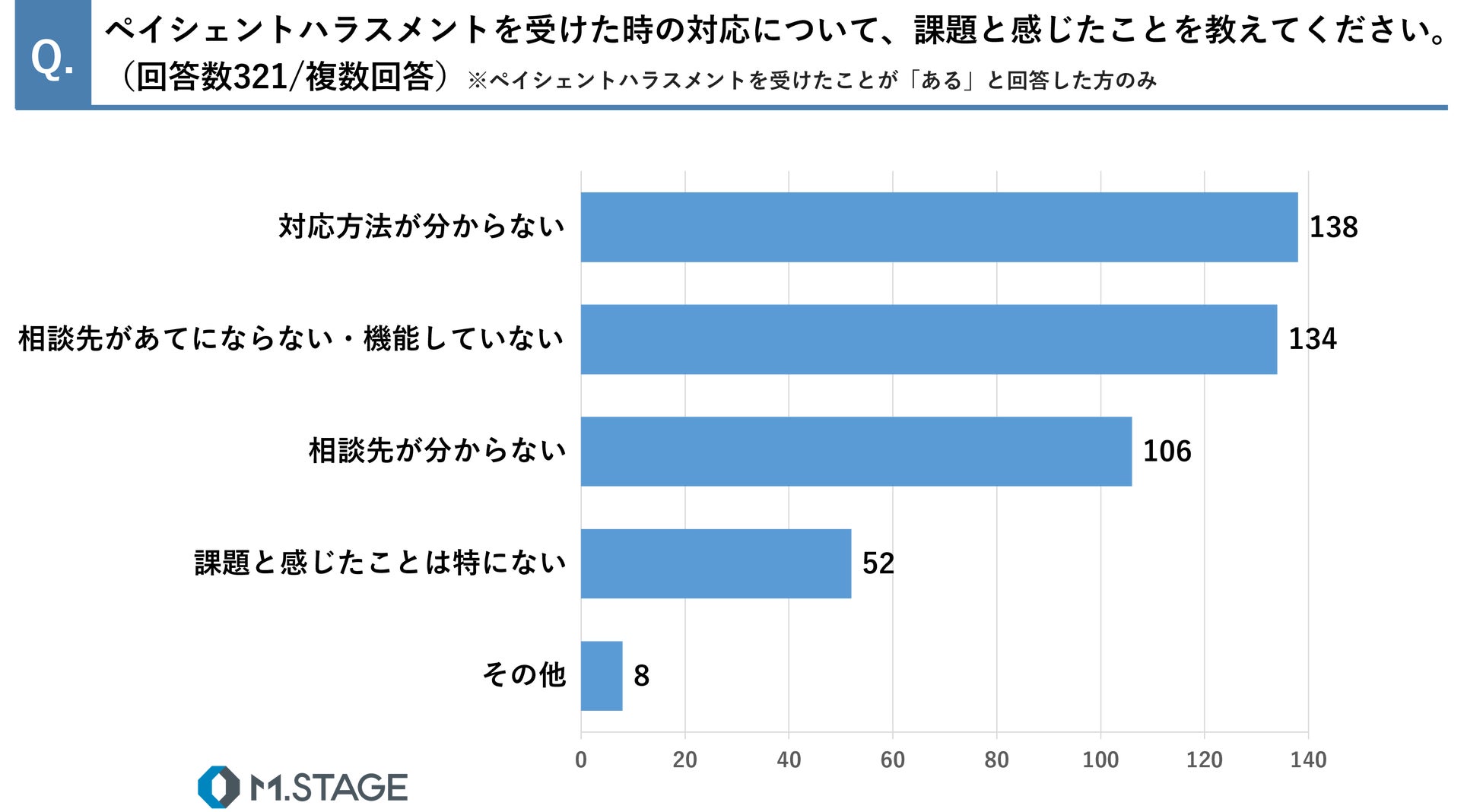 ペイシェントハラスメントを受けたときの対応について、課題と感じたこととして最も多い回答が「対応方法が分からない」(138)という結果となり、「相談先があてにならない・機能していない」(134)、「相談先がわからない」(106)が続きました。多くの医師が、勤務先の対応フローが整備されていないことを課題に感じていることが分かりました。