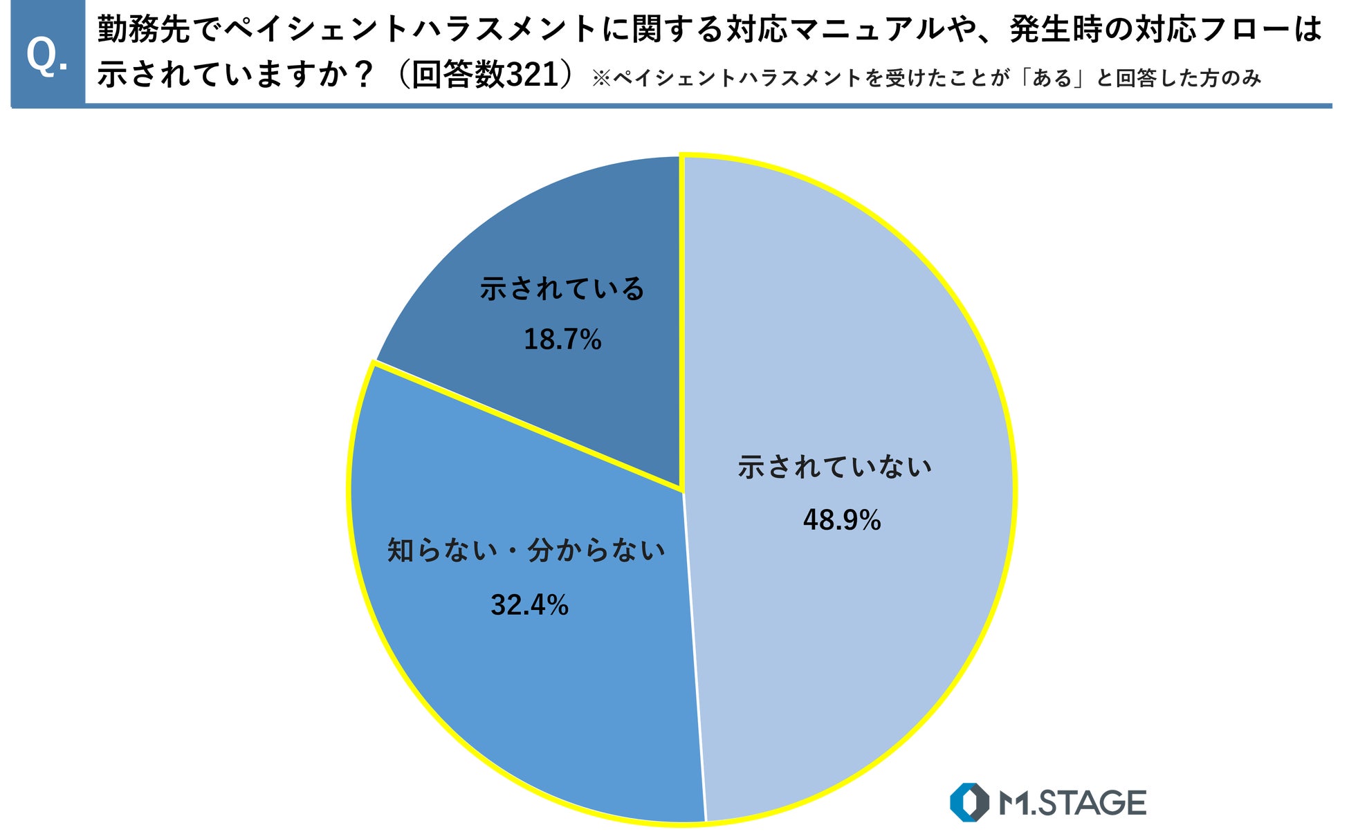 勤務先でペイシェントハラスメントに関する対応マニュアルや、発生時の対応フローが「示されている」と回答した医師は18.7%となり、8割を超える医師が「示されていない」(48.9%)、「知らない・分からない」(32.4%)と回答する結果となりました。