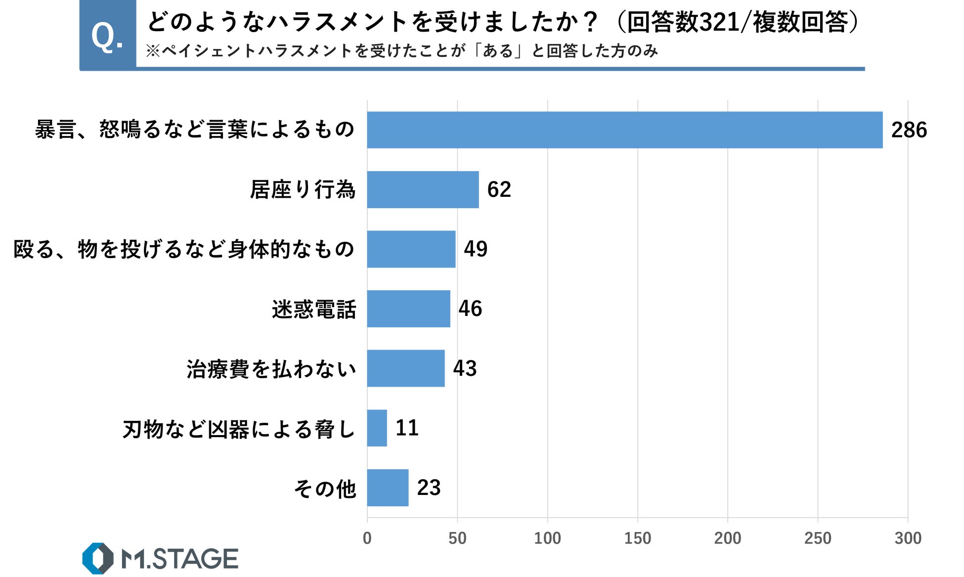 実際に受けたペイシェントハラスメントの内容では、「暴言、怒鳴るなど言葉によるもの」(286)が最も多く、次いで「居座り行為」(62)、「殴る、物を投げるなど身体的なもの」(49)が続く結果となりました。