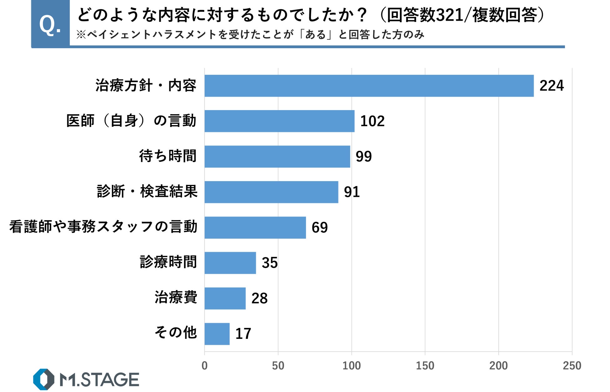 実際に受けたペイシェントハラスメントに関して「治療方針・内容」に対するものが最も多く(224)、「医師(自身)の言動」(102)、「待ち時間」(99)、「診断・検査結果」(91)が続く結果となりました。