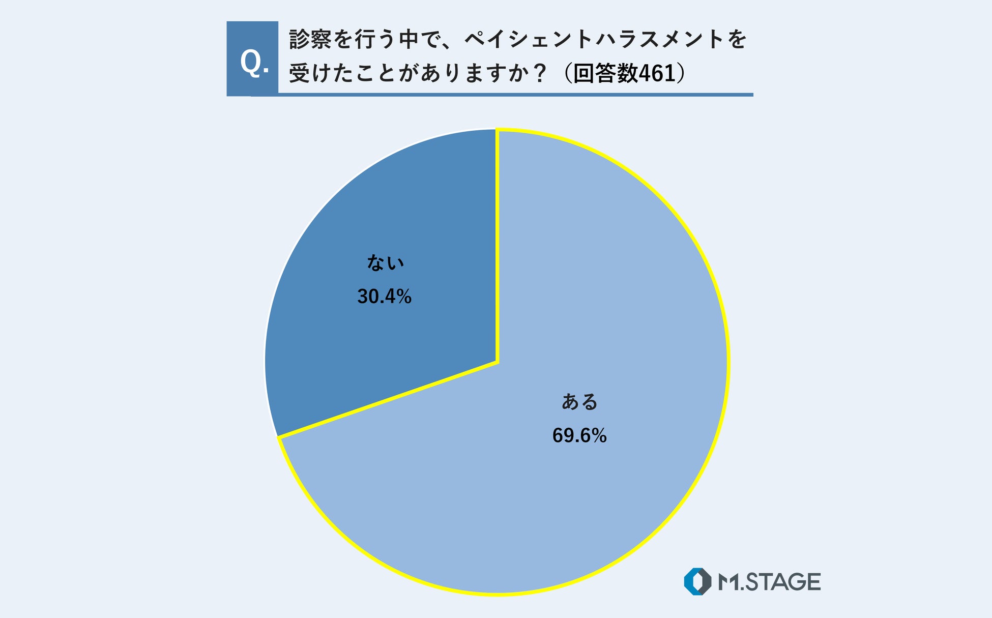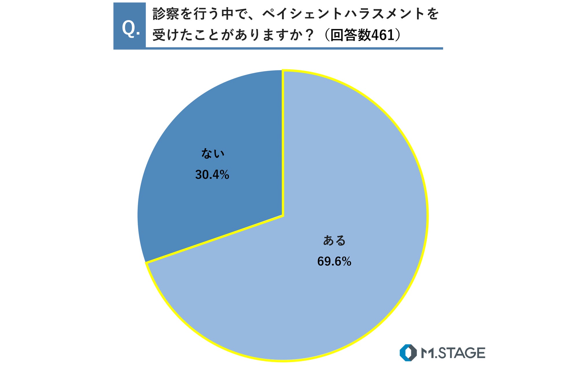 診察を行う中で、ペイシェントハラスメントを受けた経験が「ある」と回答した医師は69.6%となり、約7割の医師がペイシェントハラスメントを経験している結果となりました。