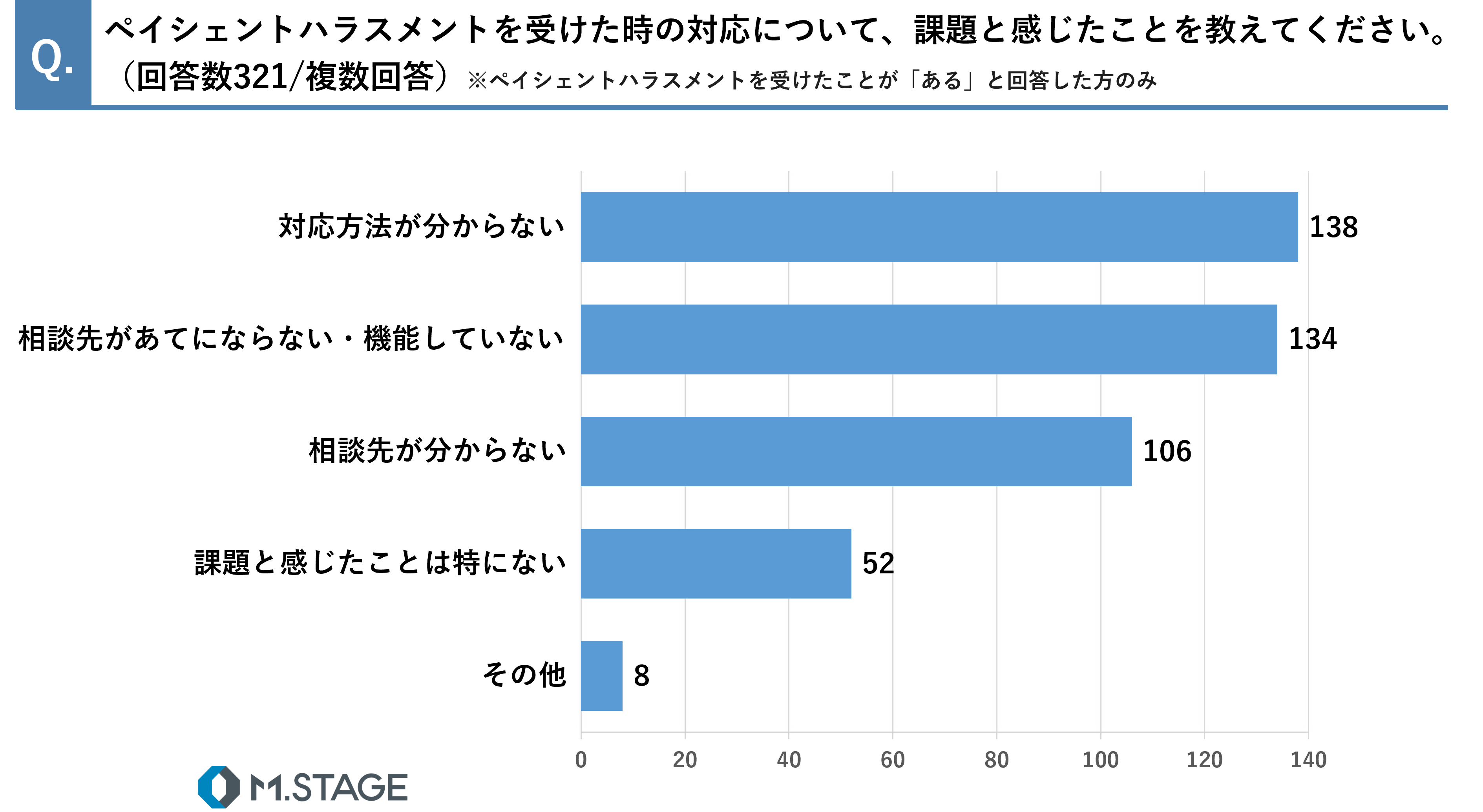 ペイシェントハラスメントを受けたときの対応について、課題と感じたこととして最も多い回答が「対応方法が分からない」(138)という結果となり、「相談先があてにならない・機能していない」(134)、「相談先がわからない」(106)が続きました。多くの医師が、勤務先の対応フローが整備されていないことを課題に感じていることが分かりました。