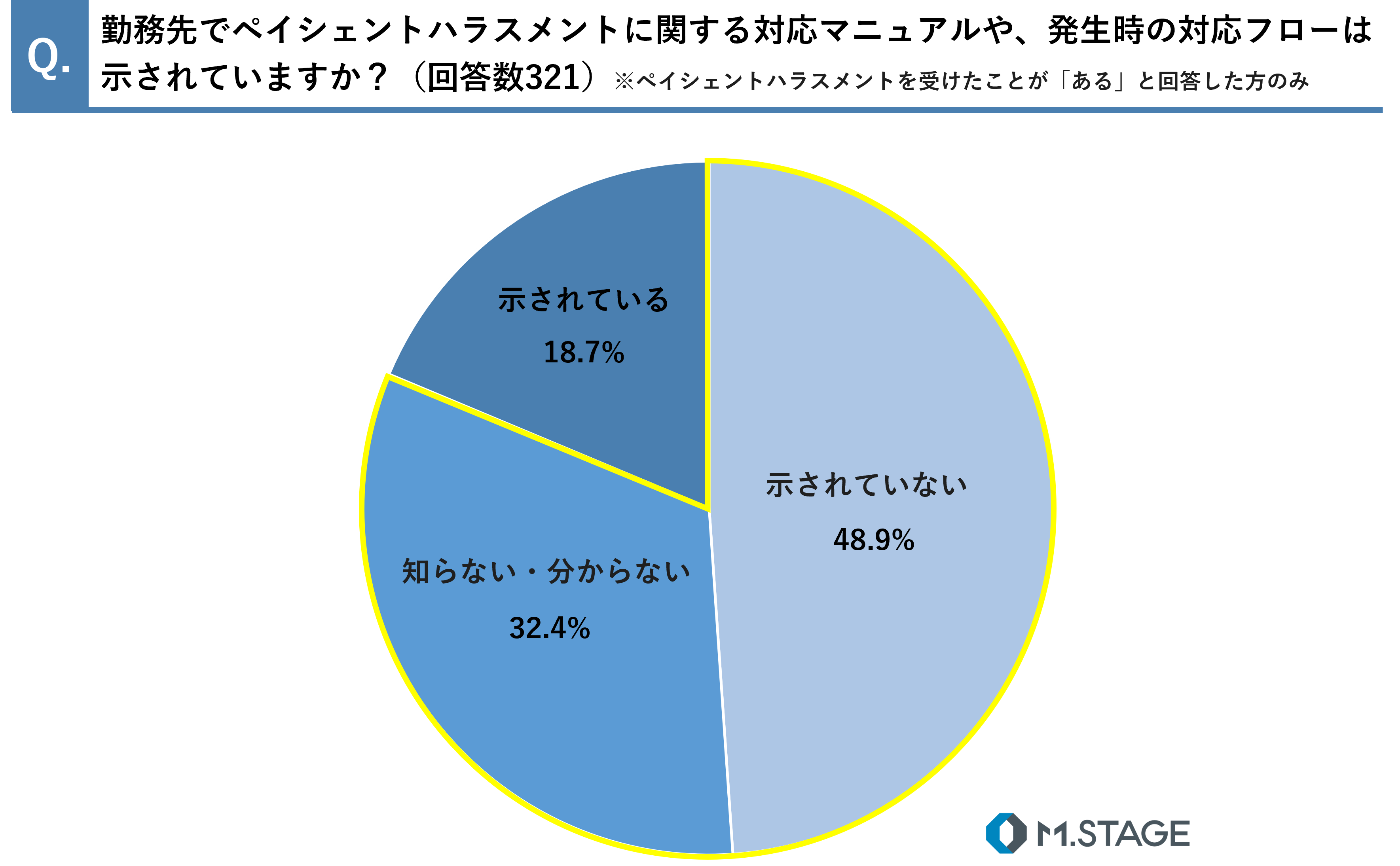 勤務先でペイシェントハラスメントに関する対応マニュアルや、発生時の対応フローが「示されている」と回答した医師は18.7%となり、8割を超える医師が「示されていない」(48.9%)、「知らない・分からない」(32.4%)と回答する結果となりました。