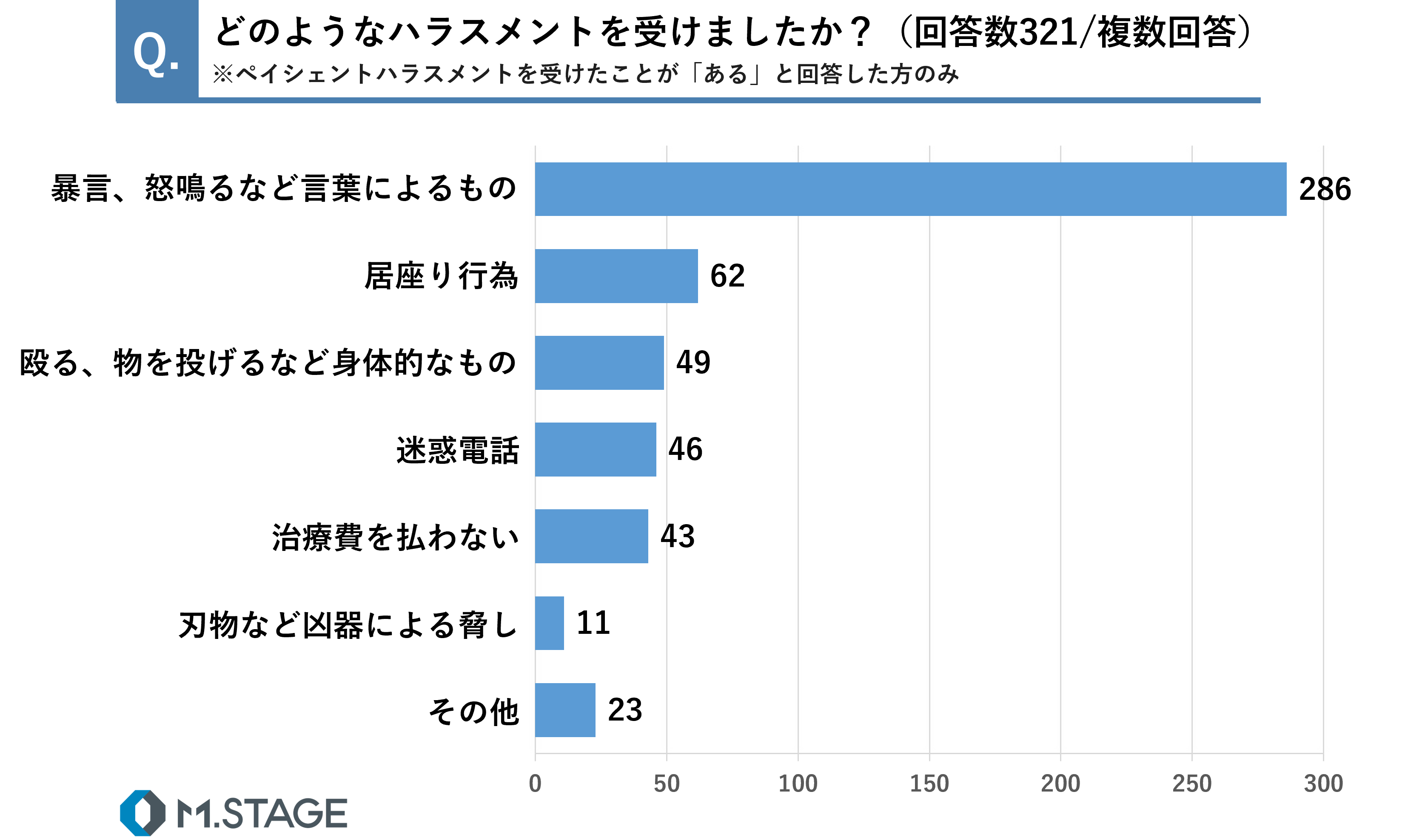 実際に受けたペイシェントハラスメントの内容では、「暴言、怒鳴るなど言葉によるもの」(286)が最も多く、次いで「居座り行為」(62)、「殴る、物を投げるなど身体的なもの」(49)が続く結果となりました。