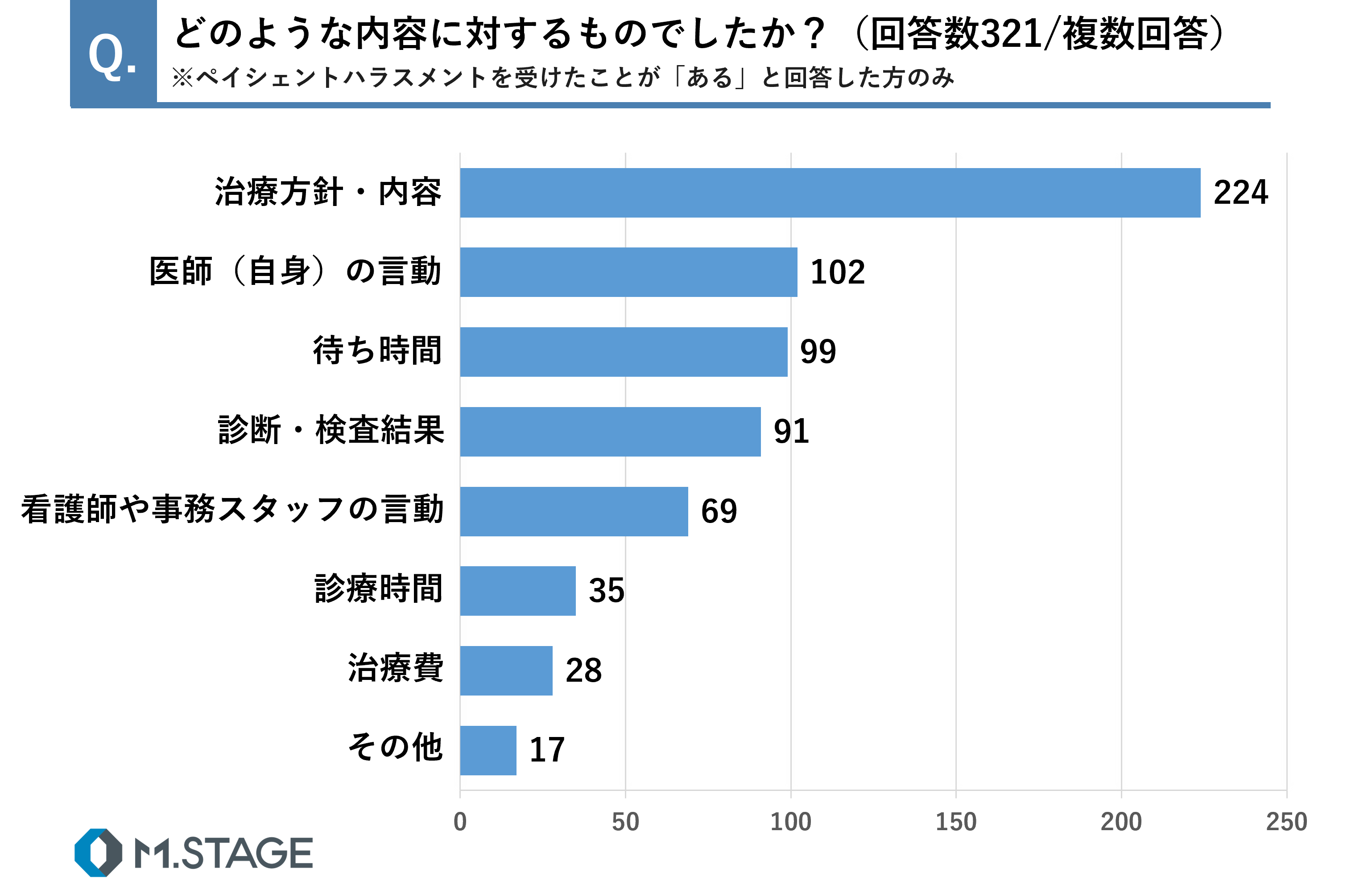 実際に受けたペイシェントハラスメントに関して「治療方針・内容」に対するものが最も多く(224)、「医師(自身)の言動」(102)、「待ち時間」(99)、「診断・検査結果」(91)が続く結果となりました。