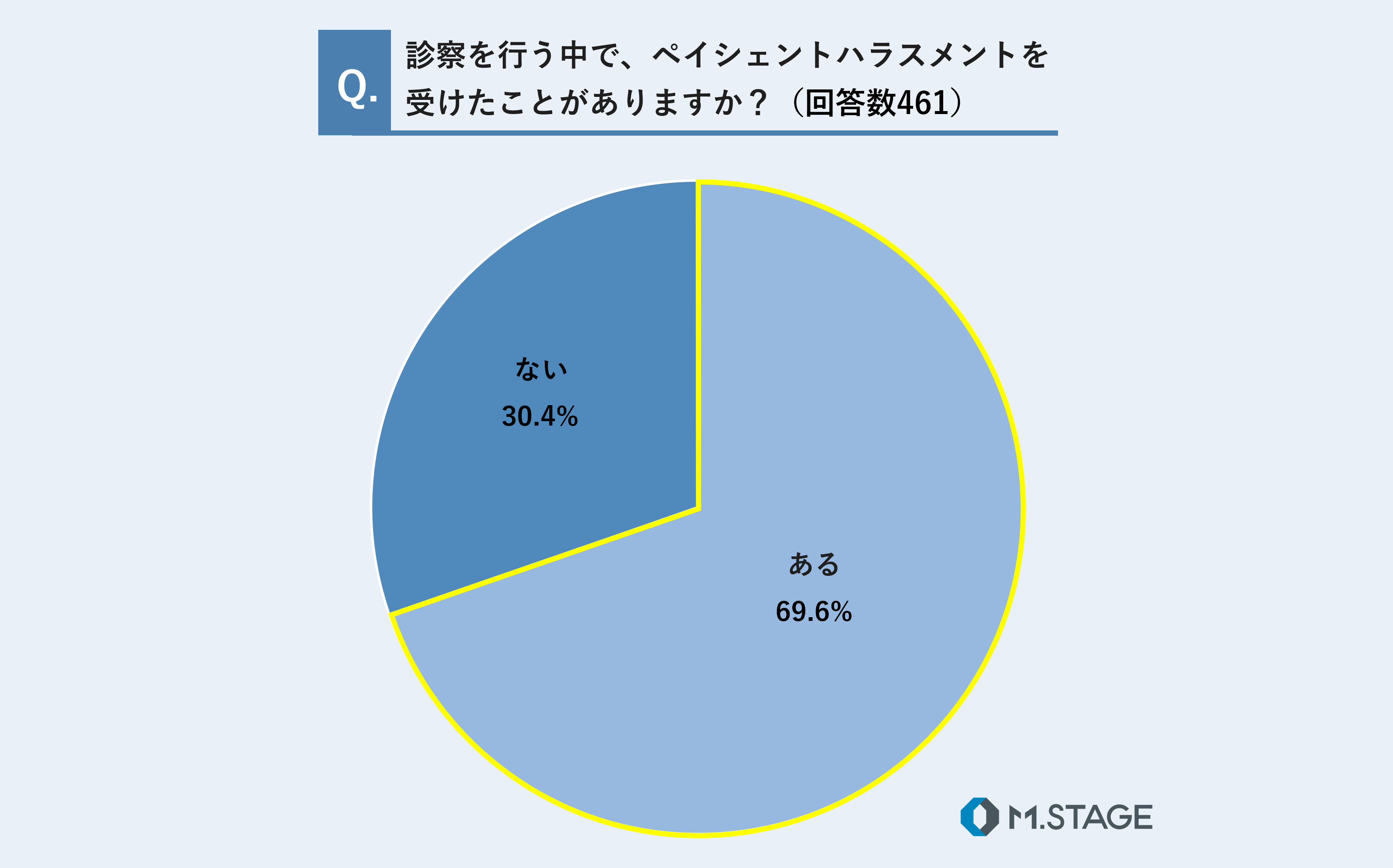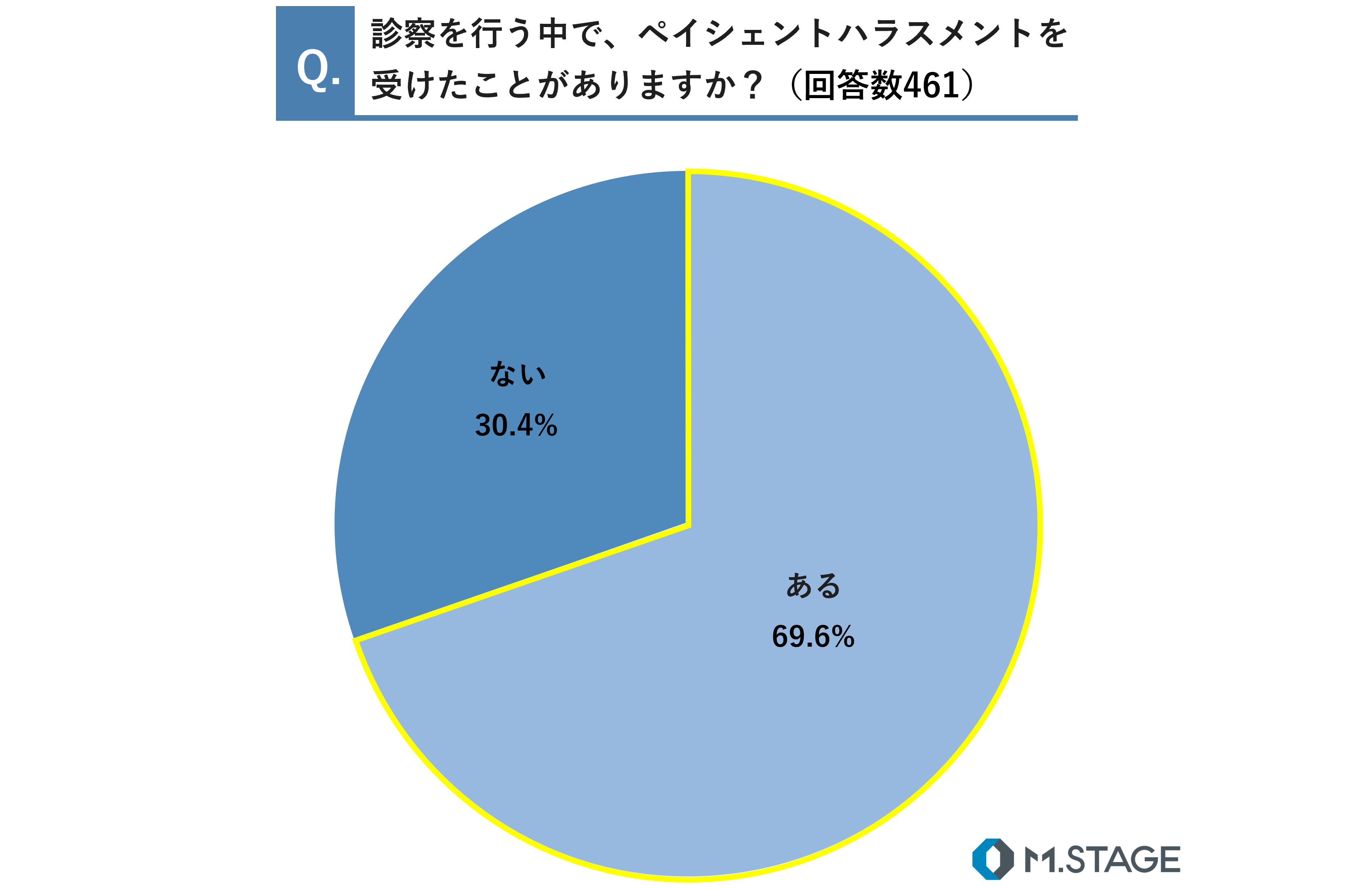 診察を行う中で、ペイシェントハラスメントを受けた経験が「ある」と回答した医師は69.6%となり、約7割の医師がペイシェントハラスメントを経験している結果となりました。
