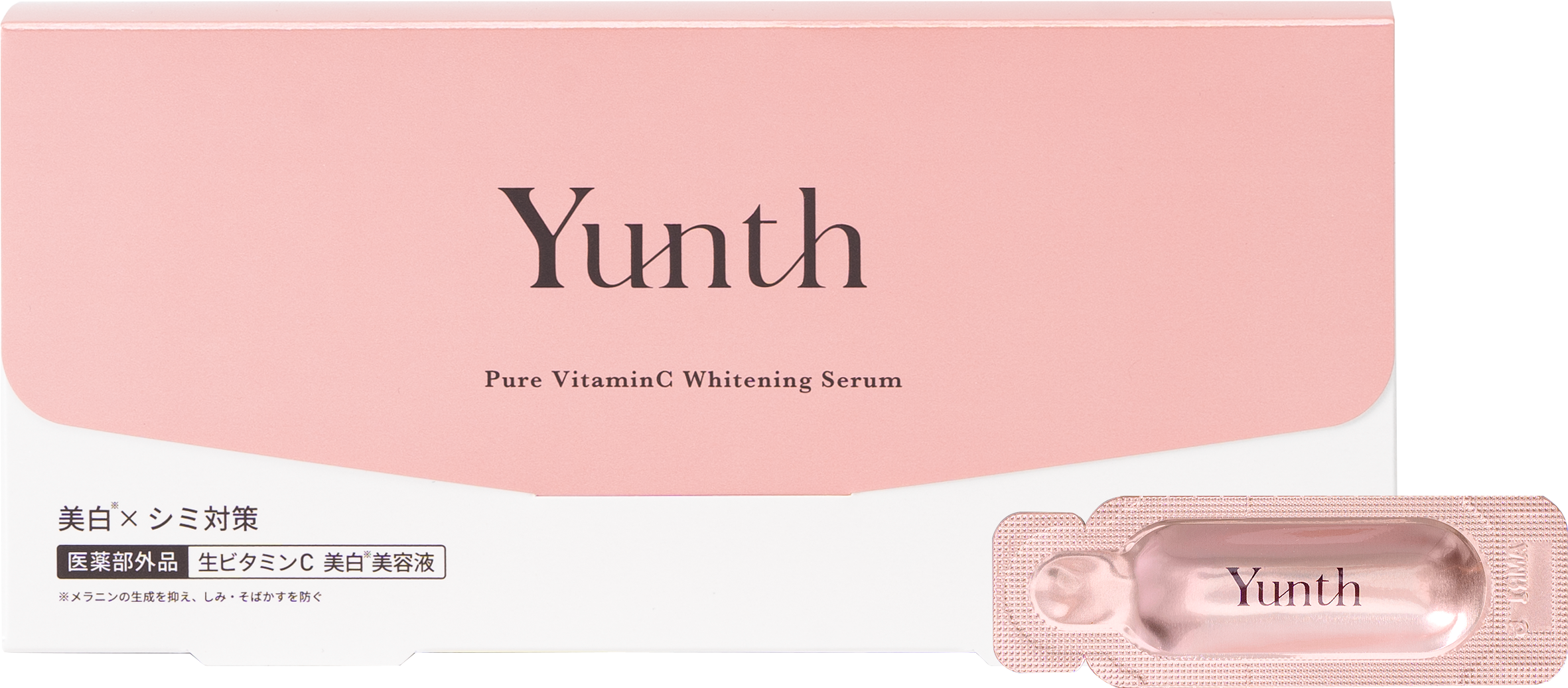 Yunth 生ビタミンC美白美容液は、生ビタミンC※1を独自の処方で閉じ込めた“使用期限30秒※2”の導入美容液。有効成分アスコルビン酸(純粋ビタミンC)が、メラニンの生成を抑え、しみ・そばかすを防ぎます。ビタミンCの力を最大限活かすため水は一切使わず、アスコルビン酸と保湿成分のみで仕上げ、1包ごとに閉じ込めました。