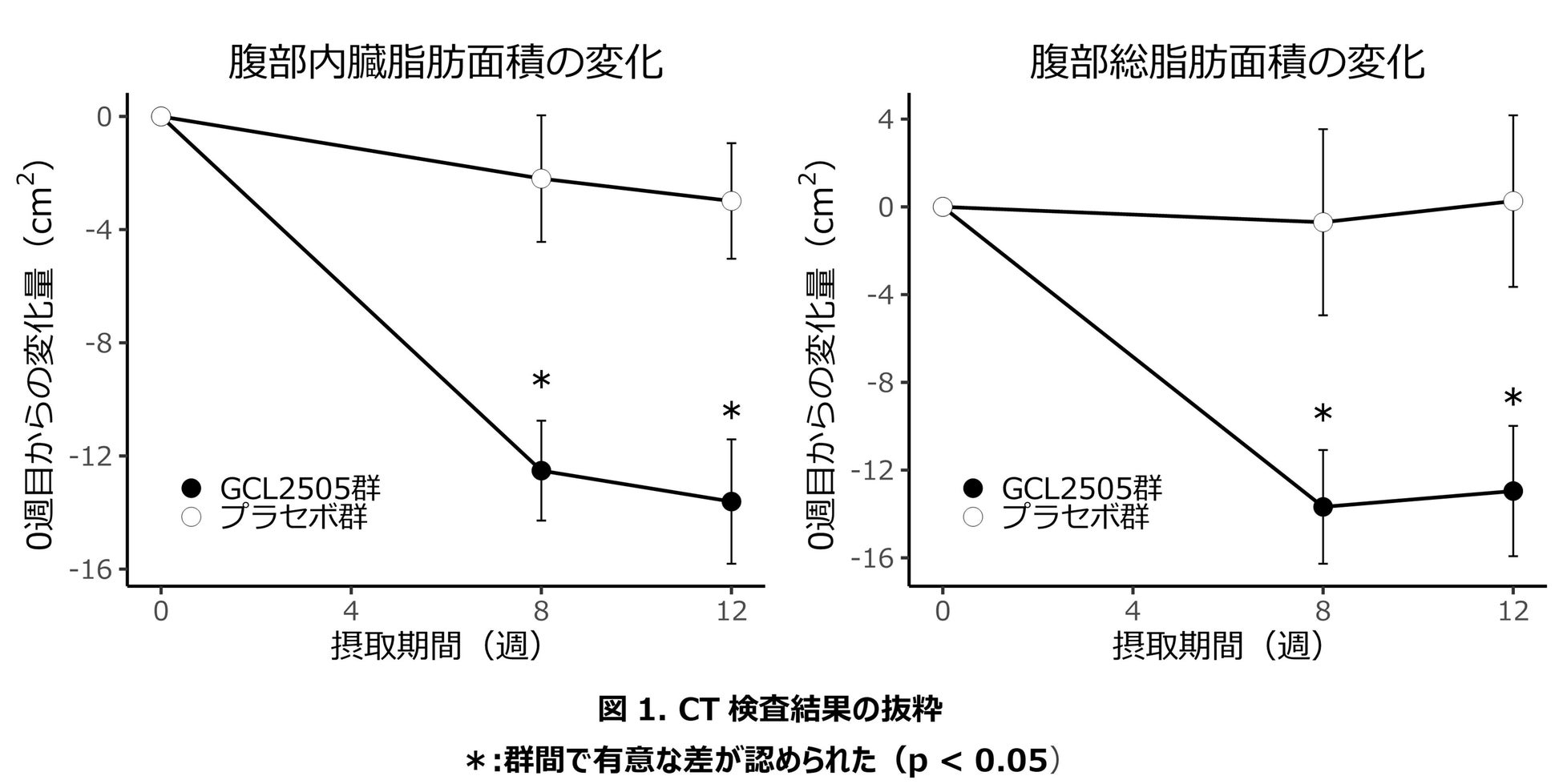 その結果、1日あたり100億個のGCL2505株と2gのイヌリンを 12週間摂取した群(GCL2505群)は、プラセボ群と比較して、CT検査による腹部内臓脂肪面積、腹部総脂肪面積が有意に低減しました。また、GCL2505群の糞便中のビフィズス菌数は、プラセボ群と比較して有意に高い値を示しました。
