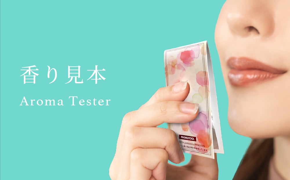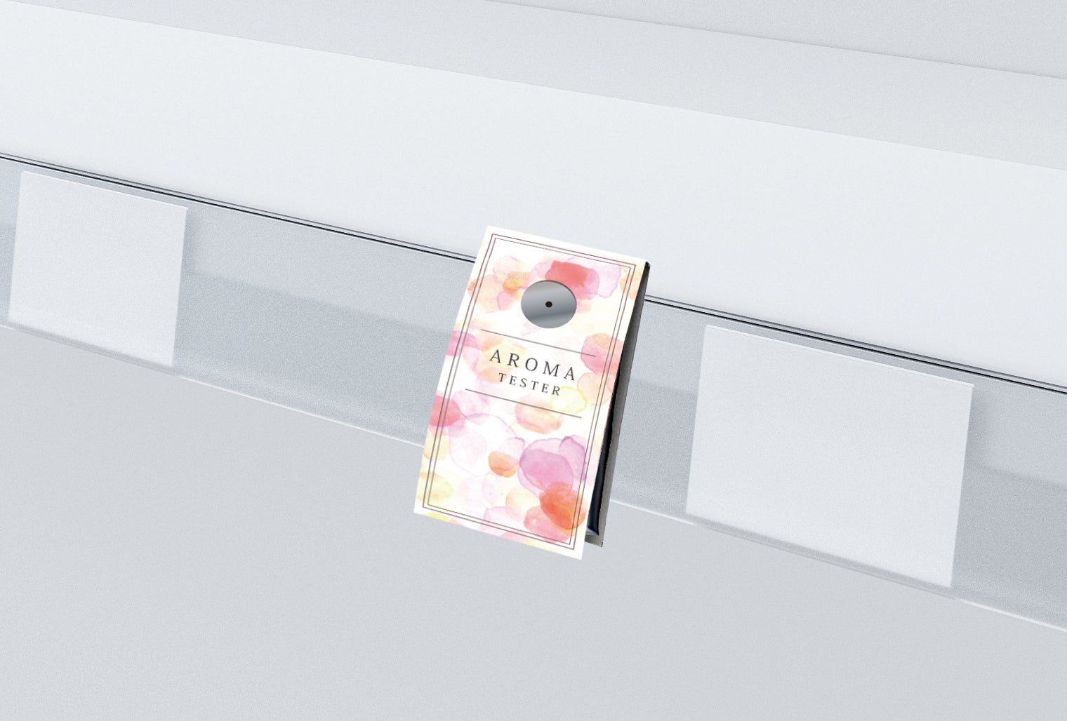 当社のアロマテスターは、香水をはじめ、化粧品や洗剤、柔軟剤、芳香剤、そしてお菓子やコーヒー等の、香りで訴求する商品の商品棚設置用の香り見本です。前面には、製品写真や文字情報を印刷でき、スーパー、コンビニエンスストア、ドラッグストア、ホームセンター等の商品棚に取り付けられます。プッシュタイプですので、前面を押すたびにフレッシュな製品の香りを試すことができます。
