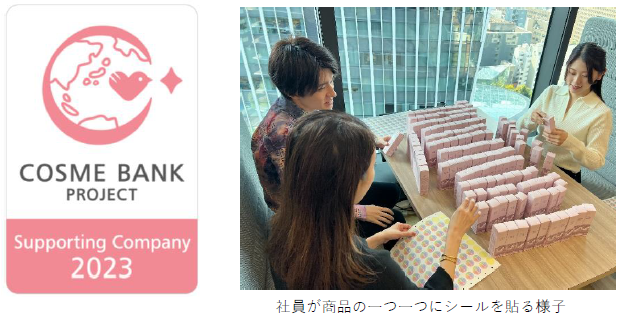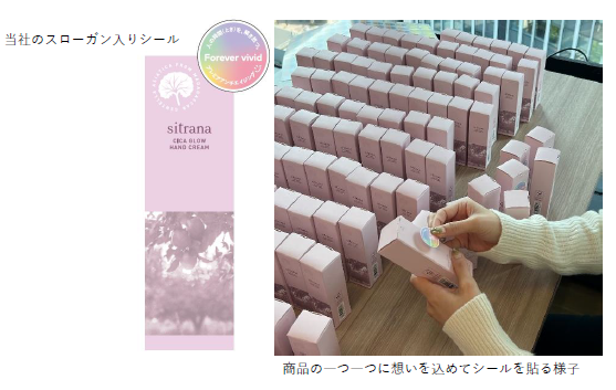 当社では、化粧品の持つ力で一つでも多くの笑顔がうまれてほしいというプロジェクトの想いに賛同し、今年発表した当社のスローガン「Forever vivid 人の時間(とき)を、解き放つ。」のオリジナルシールを、「一人ひとりがいつまでも輝いてほしい」という想いを込めて、協賛商品の一つ一つに貼付しました。