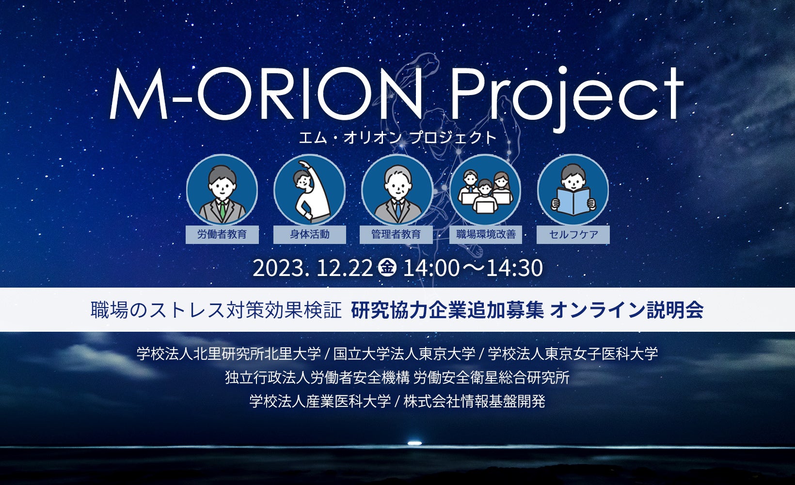 当社・株式会社情報基盤開発は2023年12月22日、 北里大学、東京大学、東京女子医科大学、独立行政法人 労働者健康安全機構 労働安全衛生総合研究所、産業医科大学、そして当社が参画する産学連携の共同プロジェクト「M-ORIONプロジェクト」の研究にご協力いただける法人企業・団体の追加募集に関するオンライン説明会を開催致します。