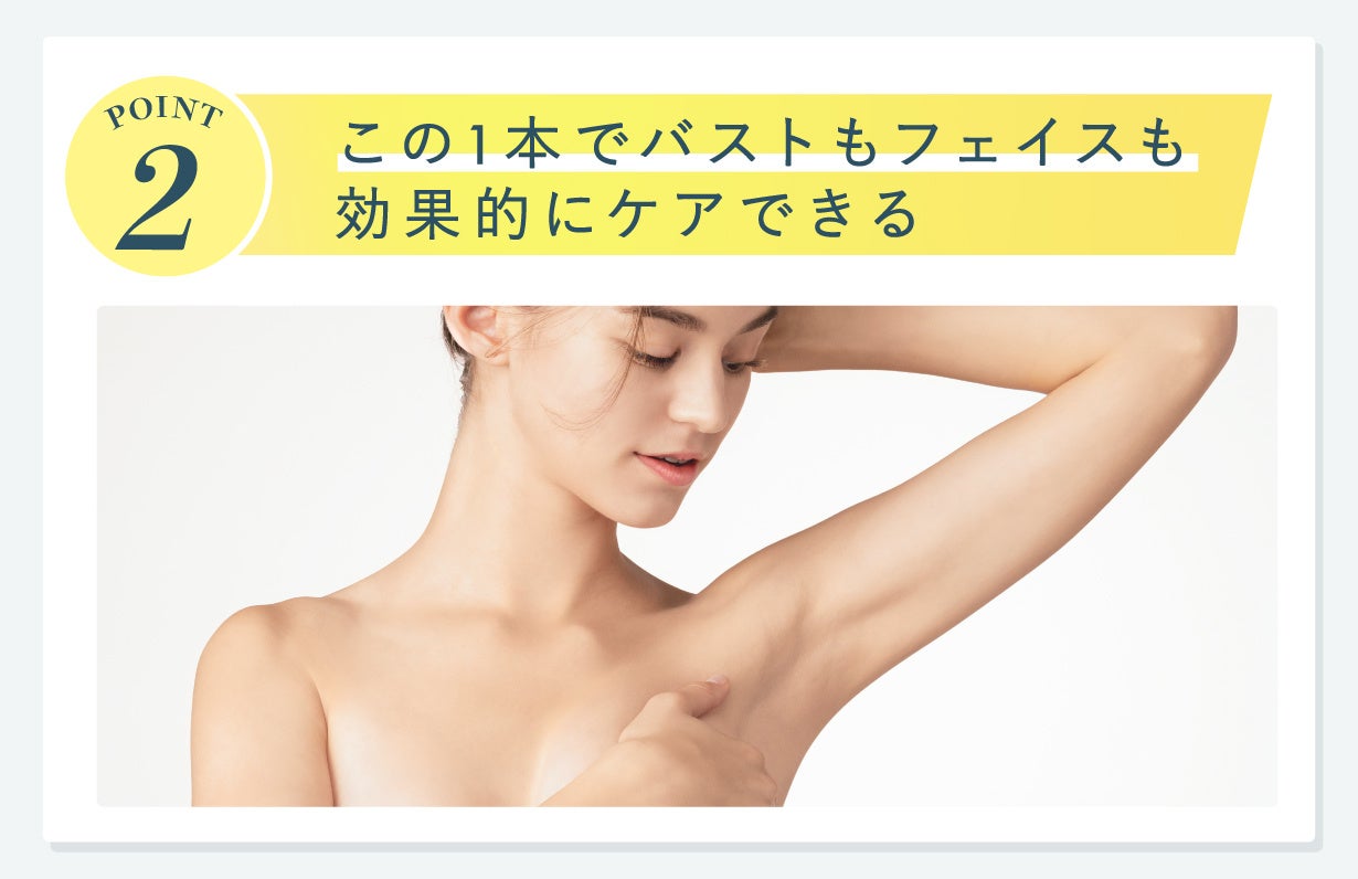 当初はバスト専用美容液を目指して開発を始めましたが、当商品のキーとなる成分「スーパービタミンC誘導体(GOVC)」は、美容クリニックのスキンケア商材にも取り入れられており、フェイシャルケアにも効果的であることが分かりました。バストと顔は同じ肌組織です。こちらの商品1本で、どちらも効率的にケアいただけます。
