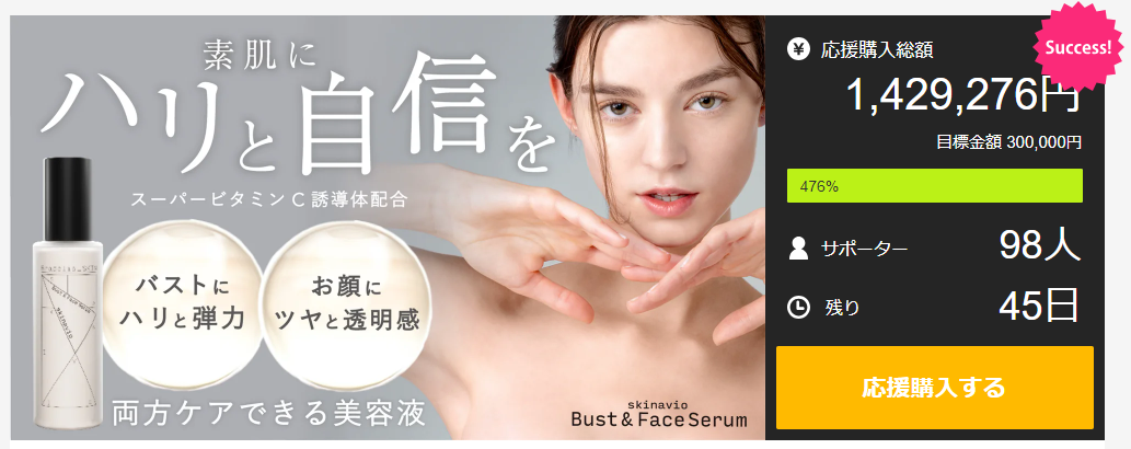 フェイシャルケアもできるバスト美容液がMakuake公開からわずか3日で100万円を達成!目標達成率476%を突破!