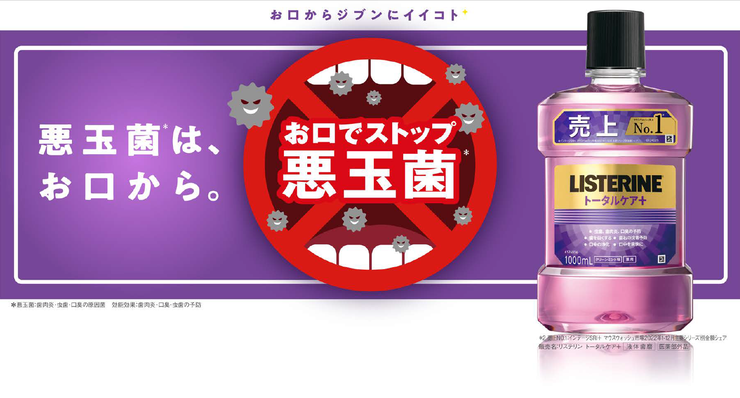 コロナ禍以降、「菌」に対する意識の高まりを背景に、オーラルケア市場は右肩上がりで拡大しています。そのような環境において、マウスウォッシュ未使用の30-40代女性にとって最大のバリアとされる「刺激の強さと味への懸念」を払拭すべく、殺菌力はそのままに、「リステリン®」史上※1最少級の刺激を実現し、さらに日本の女性が好む味を追求した本品「リステリン®トータルケア 歯周マイルド」を発売しました。口腔内菌の集合体であるバイオフィルムの中まで浸透し、お口の悪玉菌※2を「バイオ殺菌」※3することで、歯周病※4や虫歯、口臭、歯の着色など様々なお口のお悩みを解決に導きます。