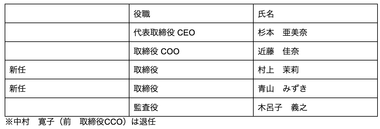 また、新しい取締役に、村上茉莉と青山みずきが就任いたします。二人は、弊社創業当初から事業に関わっており、村上は事業面から、青山は人事面から、現在のフェルマータの事業の基礎を共に築いてくれました。役員の新体制に、心強いメンバーが仲間入りを決意してくれたことで、今後のフェルマータの飛躍にご期待ください。