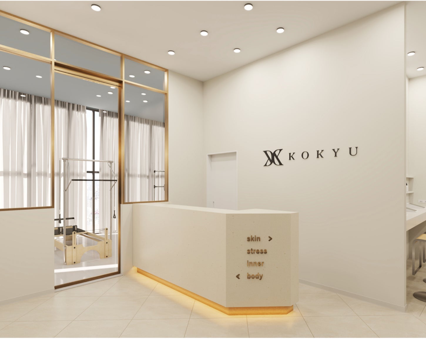 pilatesやパーソナルトレーニングの後に、よもぎ蒸しで体の芯から温め、温まったあとに極上のKOKYUスパを受けて頂く事ができたり、フェイシャルエステで肌メンテした後に公認心理師による日々の仕事や子育て等人間関係の相談をすることで、スキンケアとストレスケアを同時にケアする事が可能です。