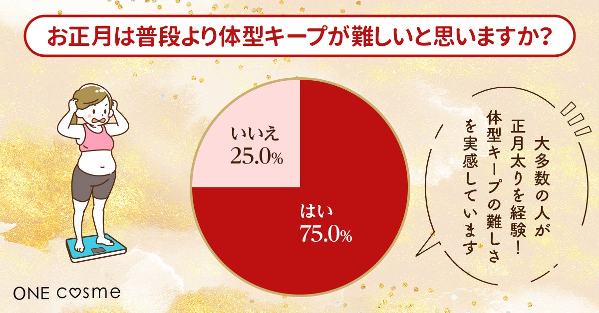 調査に協力してくれた方の75%がお正月に体型をキープすることが難しいと回答し、美容に関心が高いユーザーでも長期の休暇での正月太りを経験している事がわかりました。