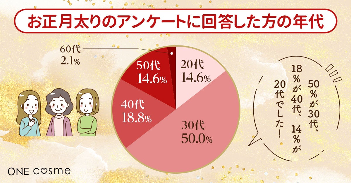 お正月太りに関してのアンケートに回答した人のうち50%が30代、18%が40代でした。