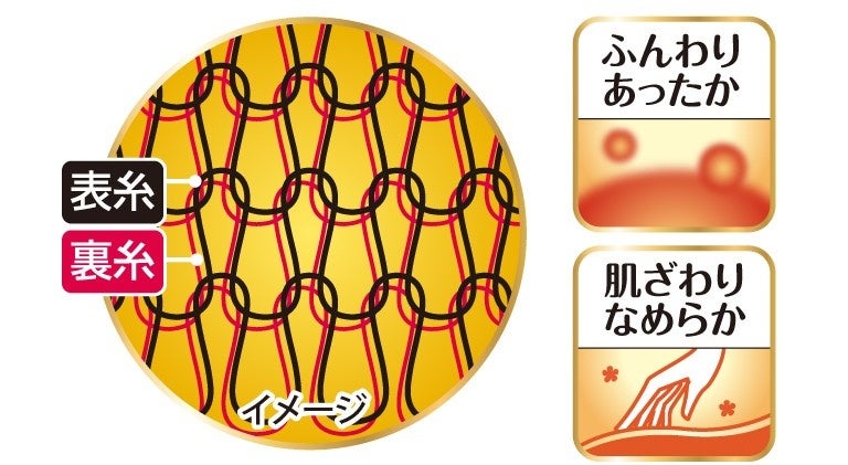 セーターやタイツなど、幅広いニット製品で使用されている「プレーティング編み」を採用で、