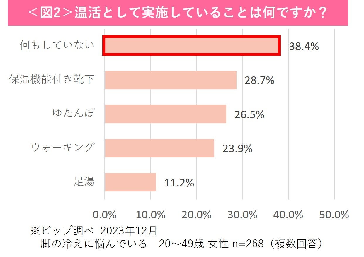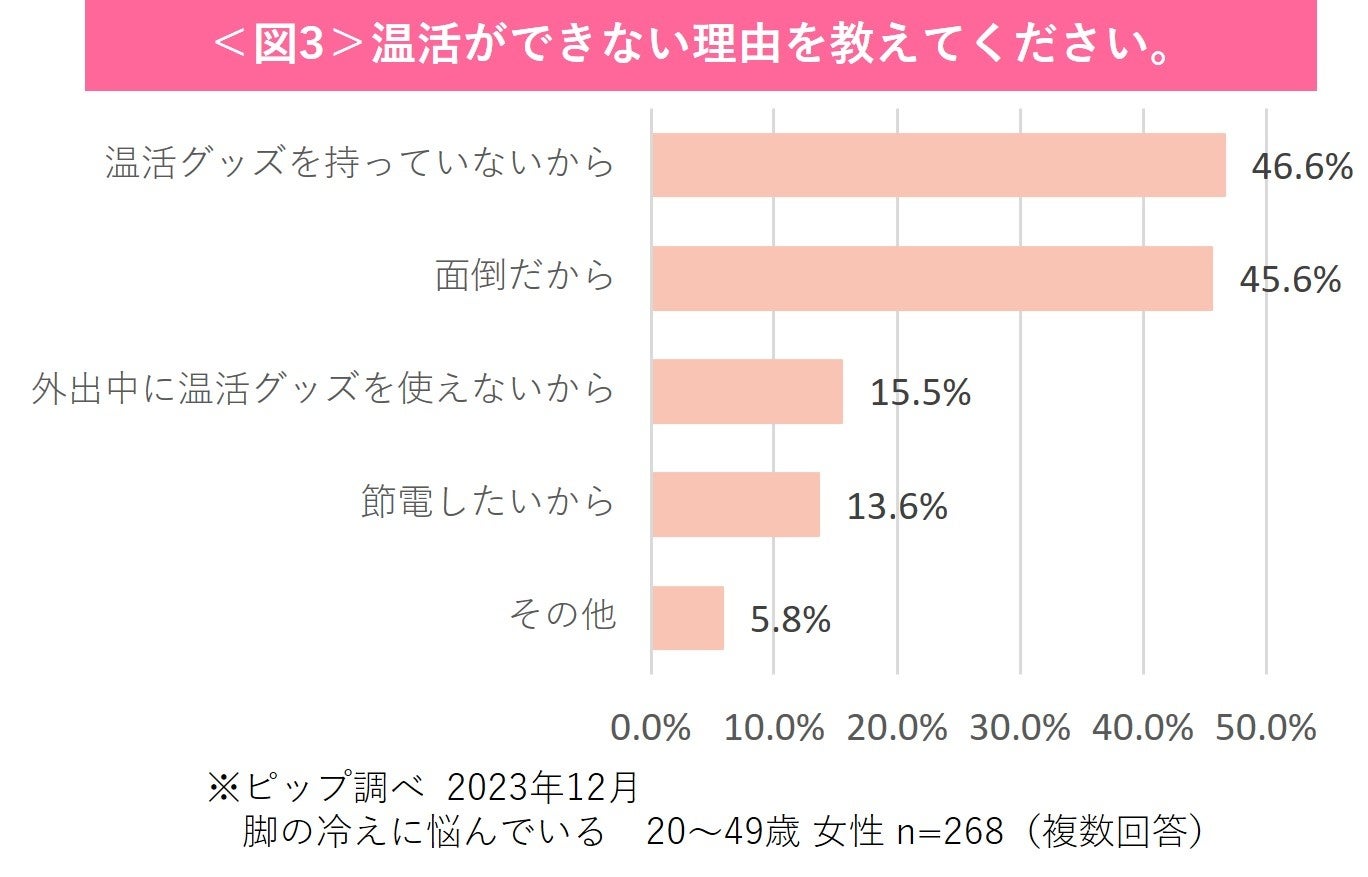 ピップの調査によると、20~40代の女性500名のうち「脚の冷え」に悩んでいる人が5割以上いることが判明しました<図1>。脚の冷えに悩む女性に、実施中の温活を調査したところ、「何もしていない」の回答が最も多い結果です<図2>。温活ができていない理由としては、「温活グッズを持っていないから」が1位に、「面倒だから」が2位と続きました。その他に、「外出中には温活グッズを使えないから」「節電したいから」と明確な理由があり、温活をしていない人も一定数いることがわかります<図3>。昨年に引き続き電気代は高騰傾向なので、節電意識の高さが伺えます。