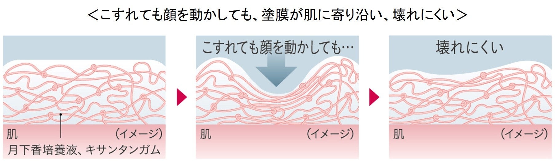 『アルブラン リペア セラムマスク』は、塗膜が肌にしっかり密着してとどまることで、肌あれを防ぎ、また、乾燥から肌を守り、うるおって明るいキメの整った肌に導く“うるおい密封膜”美容液です。今回、月下香培養液(湿潤剤)とキサンタンガム(粘度調整剤)を絶妙なバランスでブレンドすることで、日常のこすれなどに強くて落ちにくく、伸縮性に優れた壊れにくい密着型の製剤膜技術を新たに開発。塗膜が肌に密着して表情の動きにも追随するため、有効成分グリチルリチン酸ジカリウム、ブランケア成分Ⅱ*4(保湿)、花王独自のセンレンシエキス(保湿)が、肌にしっかりとどまります。とろみのある美容液が肌の表面全体を包み込み、カサカサした肌表面(角層)の平滑性を高めます。