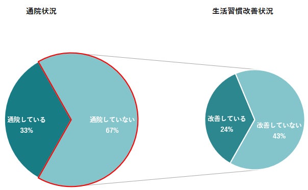 高血圧者のうち、今後高血圧を治療しようと思っている人は5割程に留まりました。また、定期的に通院していない人は高血圧者のうち66.7%、通院していない人のうち生活習慣の改善もしていない人は42.8%となりました。高血圧者のうち、通院も生活習慣の改善もしていない「高血圧放置者」は4割を超えることがわかりました。