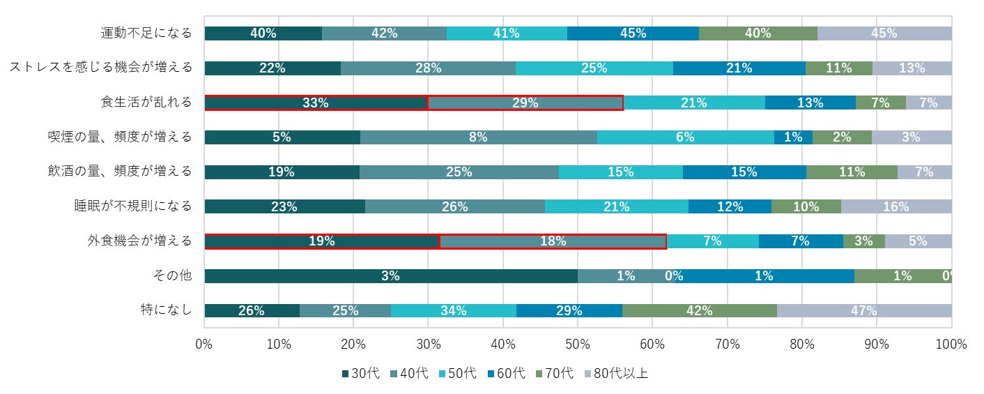 冬に乱れがちな生活習慣の悩み1位は「運動不足になる」。30~40代は「外食機会が増える」「食生活が乱れる」割合が他年代よりも多い