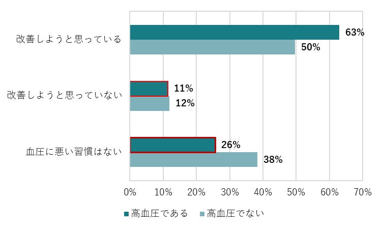 高血圧者のうち4人に1人は「血圧に悪影響がある習慣はない」と回答。高血圧で血圧に悪影響である習慣を持つのに「改善しようと思っていない」人も1割。血圧に悪影響のある生活習慣改善の障壁は「今後の生活に支障がないと思うから」