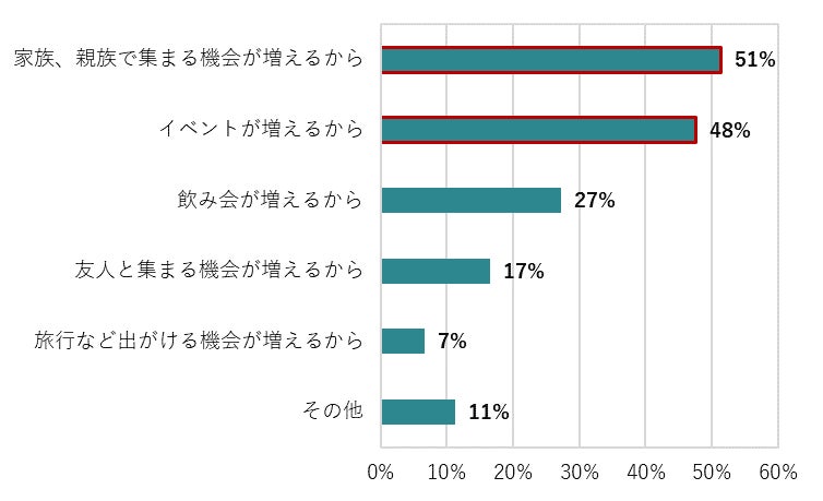 普段と比較して冬に増える、血圧に悪影響がある食事習慣1位は「(お鍋やおでんなど)汁もの(47.0%)」、次いで「(お鍋やおでんなど)練り物(42.7%)」、「(おせち料理など)保存食(41.6%)」でした。その理由を尋ねたところ、「家族、親族で集まる機会が増えるから(51.4%)」がトップという結果となりました。