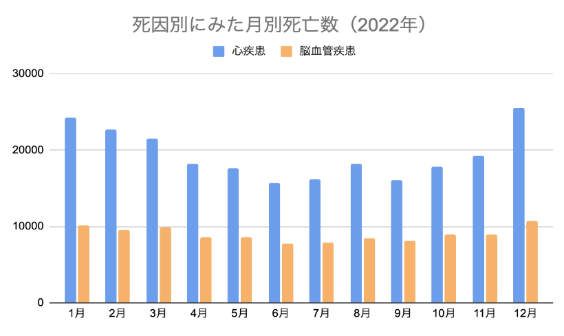 血圧が上がりやすい生活習慣を送っている方は、どのような点に留意し生活するのが良いのでしょうか。特に冬場は気温が低下することで全身の血管が収縮するため、一般的に夏場よりも血圧が上がりやすくなります。そのため心筋梗塞や脳卒中などのリスクが高まり、心疾患や脳血管疾患による月別の死亡数は夏場(6月〜9月)に比べて冬場(12月~3月)に増加します※1。