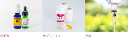 クレアージュでは、発毛剤のミノキシジルを使用した治療のほか、亜鉛・ビタミンB群・ビオチン・システインなど、髪の主成分であるタンパク質の合成に必要な成分を配合した点滴やサプリメントで補完し、髪の成長をサポートします。