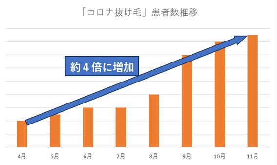 新型コロナウィルス感染症(以下、コロナ)は、感染した方の約4人に1人は後遺症を発症することが、国立国際医療研究センターが実施したコロナ後遺症についての追跡調査により明らかにされています。中でも、女性に多く見られるのが「脱毛」いわゆる抜け毛の症状です。実際に、クレアージュでは、2020年10月より、コロナ感染後の後遺症による抜け毛症状にお悩みの方に治療を行ってきました。今年4月以降のコロナ抜け毛患者様数を月別で見てみると、4月から11月にかけてコロナ抜け毛の相談件数が“約4倍に増加”していることがわかりました。