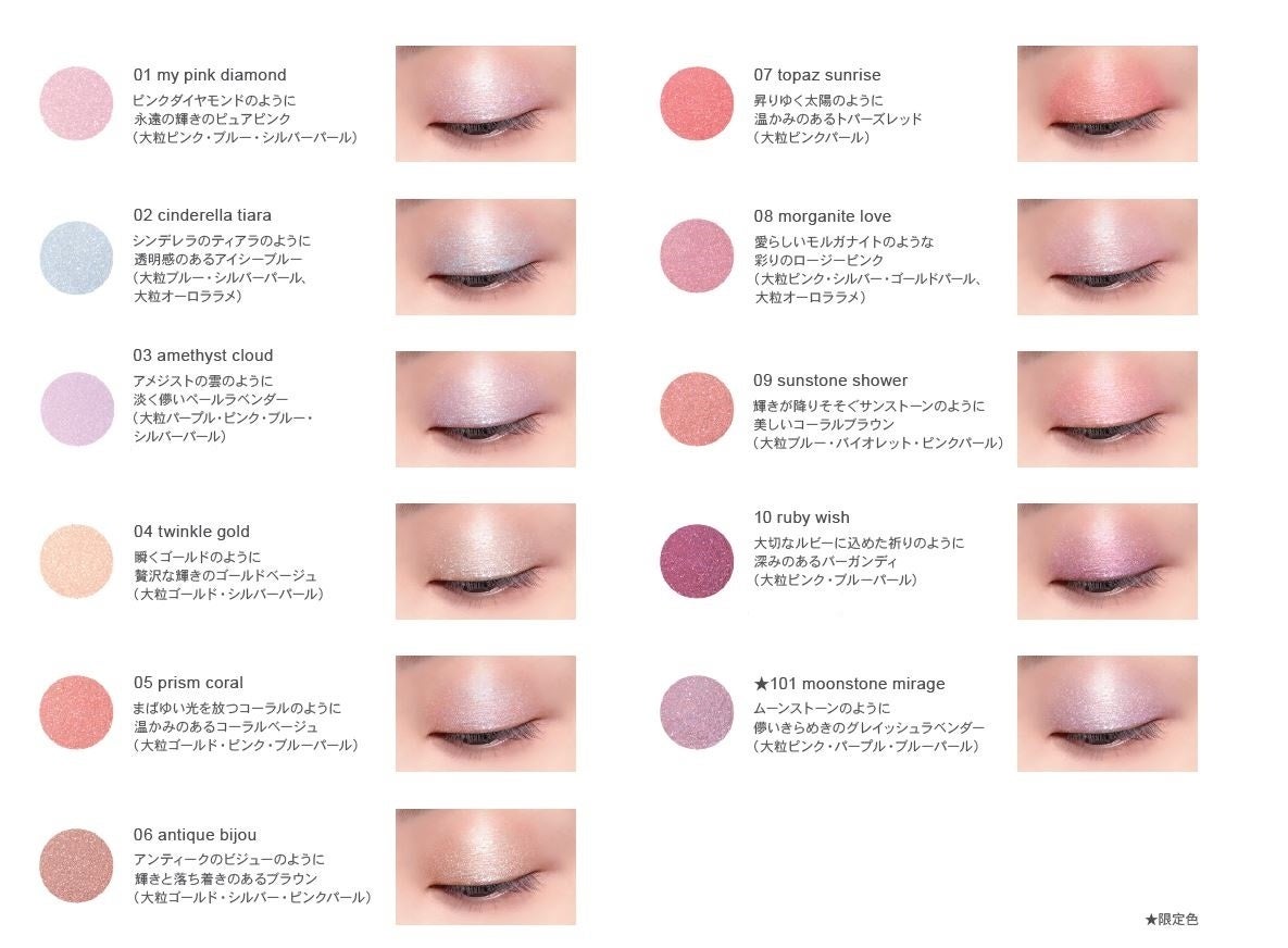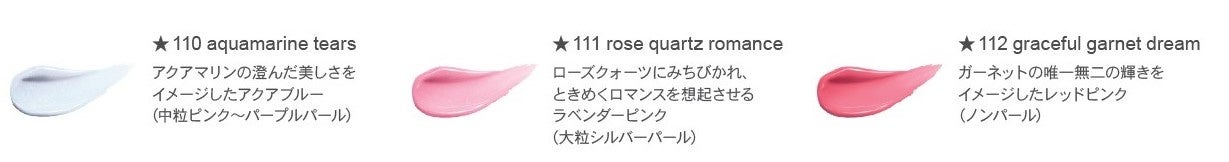 ぷるんとした触り心地でみずみずしくまぶたにフィットし、まるで星の雫のようにきらめくパールやラメが、目もとを贅沢に彩るアイカラーが全11色の豊富なカラーラインアップで新登場。ブランド史上、最高レベルの大きさのパールを最多レベルで配合し、宝石のような輝きをあたえます。さらに、水分をたっぷり配合したベースが、みずみずしいタッチでのび広がり、まぶたにうるおいをあたえながら、濡れたようなツヤのある目もとに仕上げます。ぷるんとした感触で密着感を高めるクリスタルビジューゲルを配合しているため、まばたきをしてもパールやラメが落ちにくく、化粧もちのよさを叶えます。