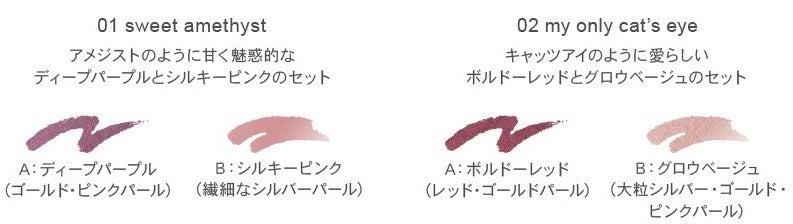 やわらかく目もとを締め、彩りをあたえるアイライナーカラーと、まぶた&涙袋にやわらかい明るさを灯すアイカラーの2色が1本になった、ウォータープルーフタイプのスティック型アイカラーが限定発売。軽いタッチのオイルを配合しているため、驚くほどなめらかに描け、負担感がなく美しい仕上がりです。色素やパールの美しさをオイルで固めているので、オイルツヤのある仕上がりと透明感のある発色が叶います。