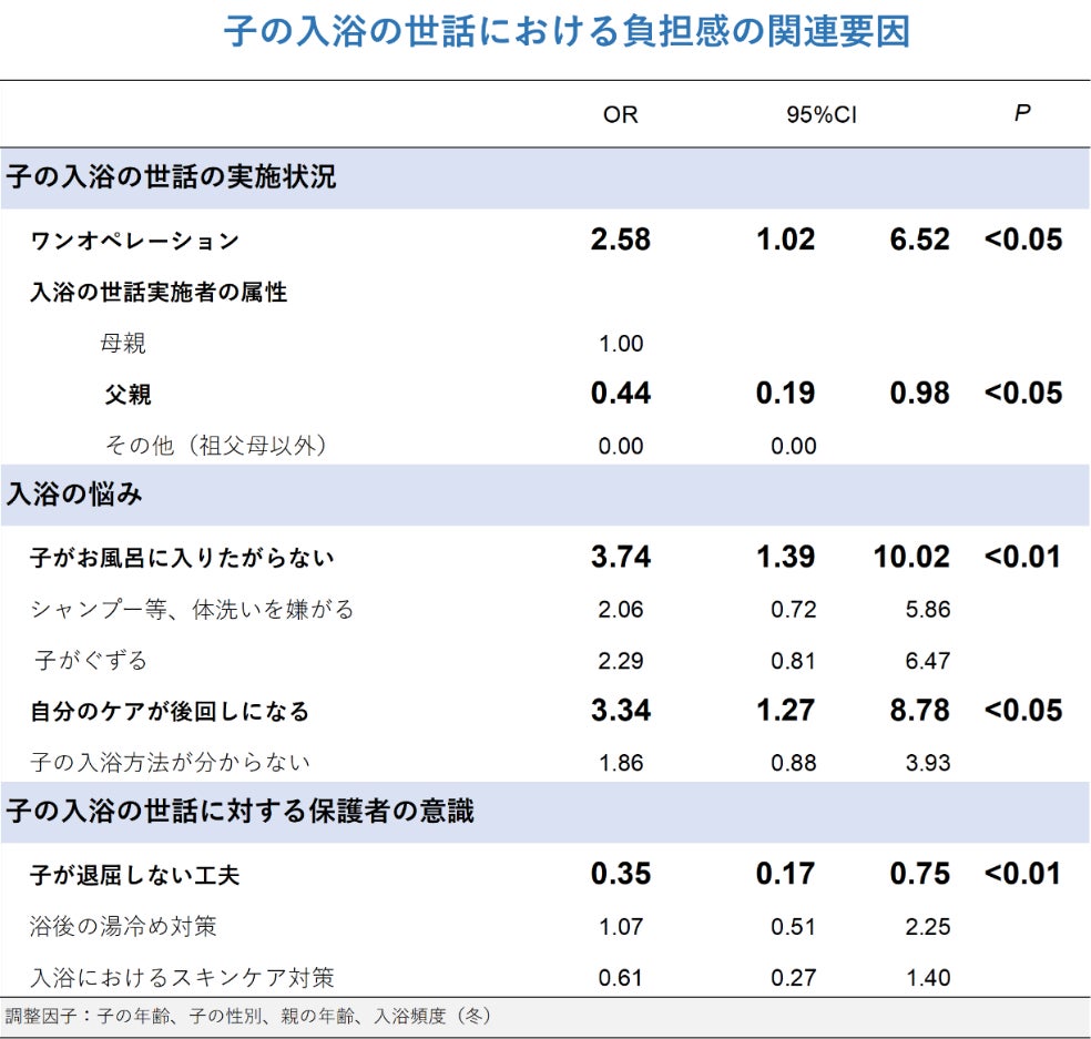 95%CI*2:1.02-6.52)、「子がお風呂に入りたがらない」(OR*1:3.74, 95%CI*2:1.39-10.02)、「自分のケアが後回しになる」(OR*1:3.34, 95%CI*2:1.27-8.78)と関連があることが分かりました。 *1:OR(オッズ比)*2:95%CI(95%信頼区間)