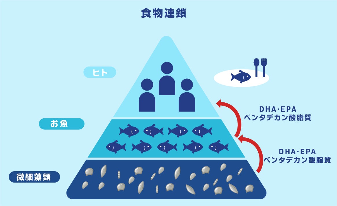 微細藻類は、DHA(ドコサヘキサエン酸)・EPA(エイコサペンタエン酸) など、身体の健康のための重要な脂質を作っていますが、実は、魚はDHA(ドコサヘキサエン酸)・EPA(エイコサペンタエン酸)を作っていないのです。