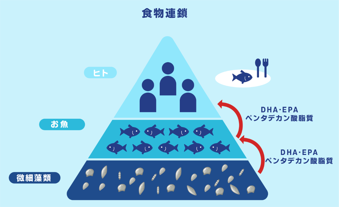 微細藻類は、DHA(ドコサヘキサエン酸)・EPA(エイコサペンタエン酸) など、身体の健康のための重要な脂質を作っていますが、実は、魚はDHA(ドコサヘキサエン酸)・EPA(エイコサペンタエン酸)を作っていないのです。