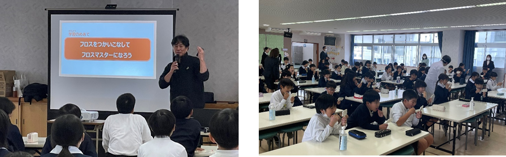 また、2023年12月15日(金)に山口市立小郡小学校では、山口県歯科医師会の小山会長が「おうちでフロスチャレンジ」実施に向けた事前授業を行い、デンタルフロス使用の効果ついて、動画等を交え楽しく説明しました。