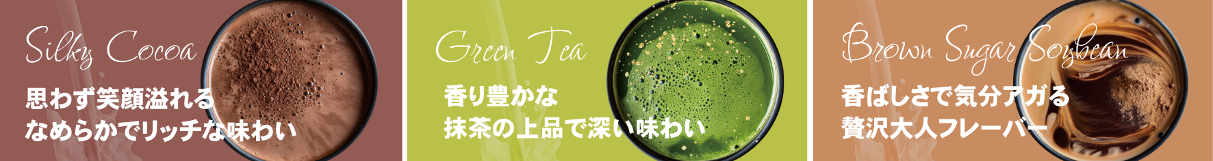 シルキーココア風味 / 極み抹茶風味 / 黒糖きなこ風味