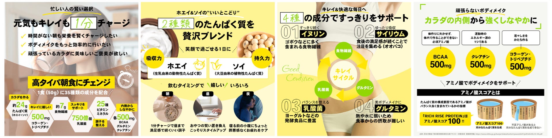 「RICH RISE PROTEIN」のコンセプトは、“カラダが喜ぶ 目覚めの一杯”。時間栄養学において、朝食は体内時計(一日の体のリズム)を整える鍵であると言われる一方、20~40代ではおよそ4人に1人、働き盛りの40代一人世帯では約43%が朝食を抜いている(※1)とのデータがあります。そこで本製品は、忙しい方でも元気やキレイの源を賢くチャージできるよう35種類の厳選成分を配合し、1食(50g)で1日に必要な栄養素の1/3を摂取できる(※2)よう企画しました。水や牛乳に溶かし、振って飲むだけの1分足らずで健康&美容に嬉しい成分をしっかり摂れるため、クイックで美味しい【高タイパ朝食】を探している方や、朝に限らず忙しさからつい食事が後回しになってしまう方、時間を賢く節約しつつ理想の自分に着実に近づきたい効率重視派の方に特にオススメです。