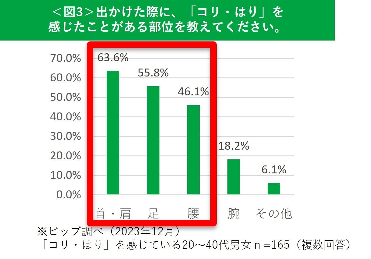 さらに「コリ・はり」を感じたことのある165名に「出かけた際に『コリ・はり』を感じたことがある部位」を聞いたところ、「首・肩(63.6%)」に続いて「足(55.8%)」「腰(46.1%)」 という結果になりました。