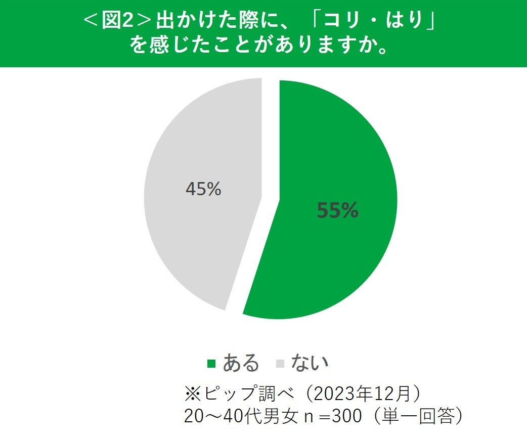 20~40代の男女300名に「出かけた際に、『コリ・はり』を感じたことがありますか。」と聞いたところ、「コリ・はり」を感じたことがあると回答した人は55.0%で、半数以上となりました<図2> 。
