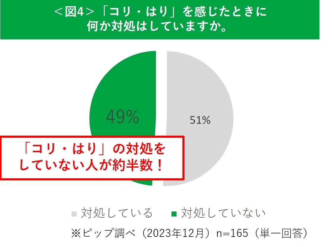 ✓ 「コリ・はり」を感じている人の約半数が対処できていない結果に。