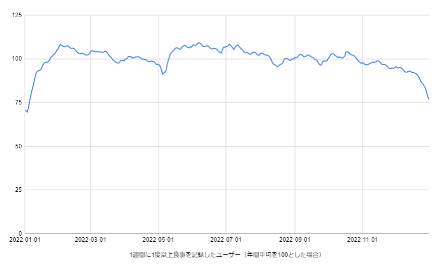 2022年1年間(1月1日〜12月31日)のカロミルユーザーの食事記録状況を調査したところ、1週間に1度以上食事を記録したユーザーは12月24日ごろから減少傾向となることがわかりました。12月29日~1月4日の年末年始期間の記録率は、年間平均と比較すると記録率が約3割低下していることが明らかになりました。